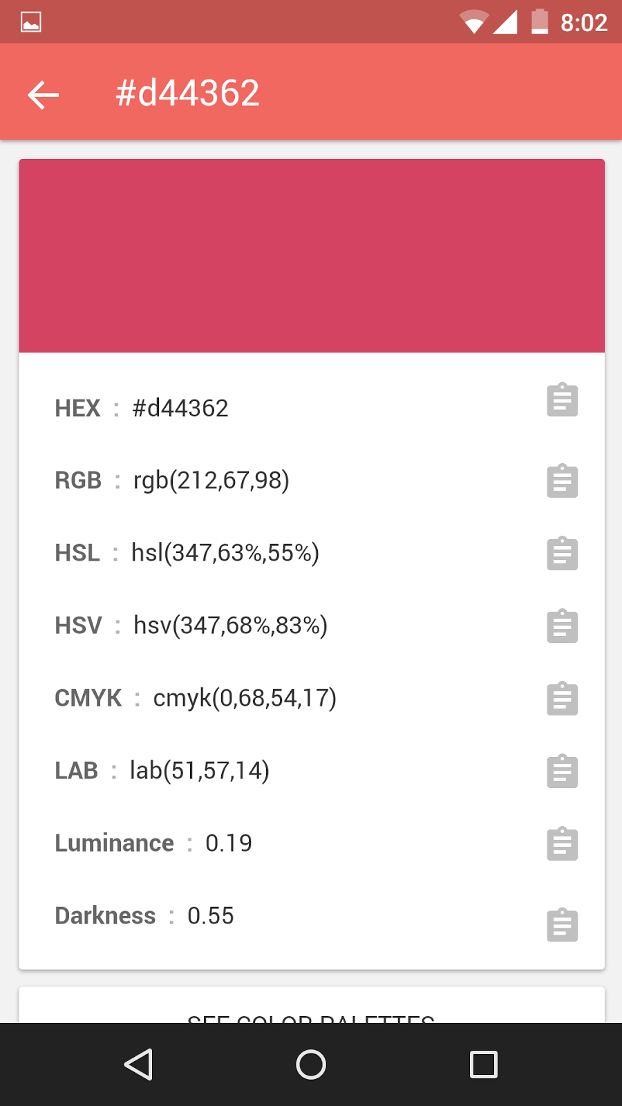 Ask yourself, when someone asks you about a color or palette you use for some project, what do you reply? Most likely the hex code(s) I presume. But the hex code doesn't help visualize the color. Isn't it always better to show the color instead of just telling the hex code? With Croma installed on your mobile device, you can show him the colors complete with the hex code, RGB, HSL, HSV, LAB and CMYK (approx.) values. Yeah, I know, the colors your phone won't look perfect. But it's the best you can do when what you're carrying with you is only your phone or tablet.
